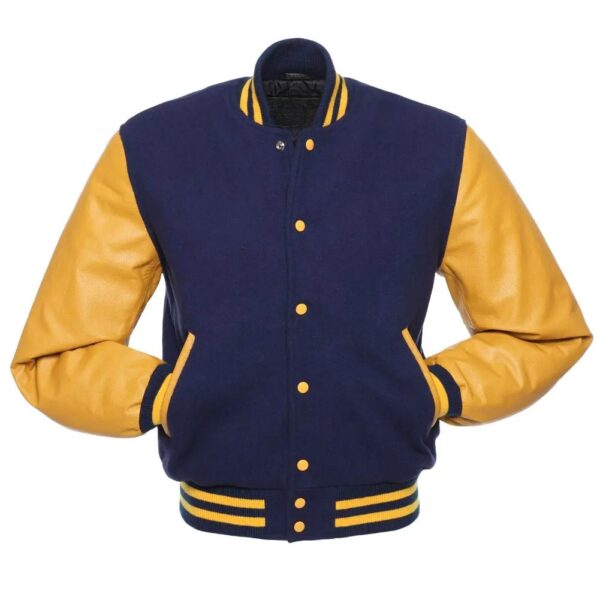 The Navy Wool/Gold Leather Varsity Jacket by Jacket Shoppe captures the spirit of classic American fashion with a bold, timeless edge. Crafted from a durable 24 ounce navy wool body and genuine gold cowhide leather sleeves, this jacket delivers unmatched warmth, comfort, and sophistication. Every detail is carefully designed to balance traditional craftsmanship with modern style.