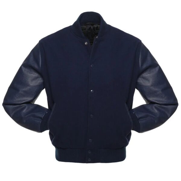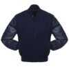 The Navy Wool/Navy Leather Varsity Jacket by Jacket Shoppe is a perfect blend of classic American heritage and modern craftsmanship. Expertly tailored with a 24 ounce navy wool body and matching navy cowhide leather sleeves, this jacket delivers warmth, comfort, and timeless style in one sleek design. Its rich monochrome navy look adds a sophisticated edge, making it a versatile wardrobe essential for athletes, students, and everyday fashion lovers.